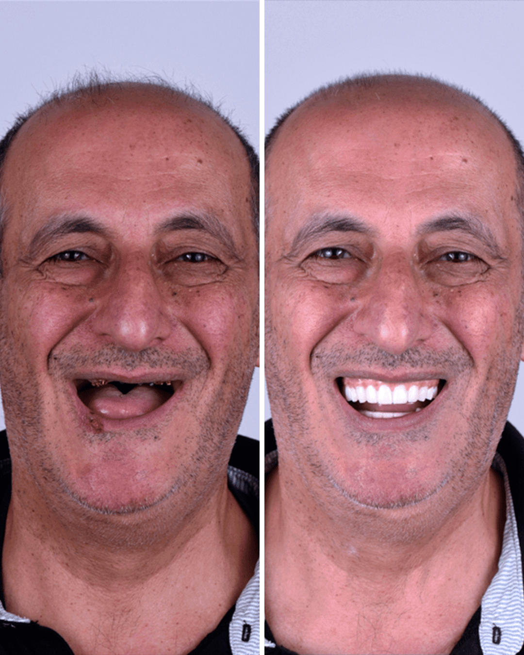 Veja a diferença na foto: do "antes" completamente sem dentes e o "depois" com um sorriso natural e bilhante.