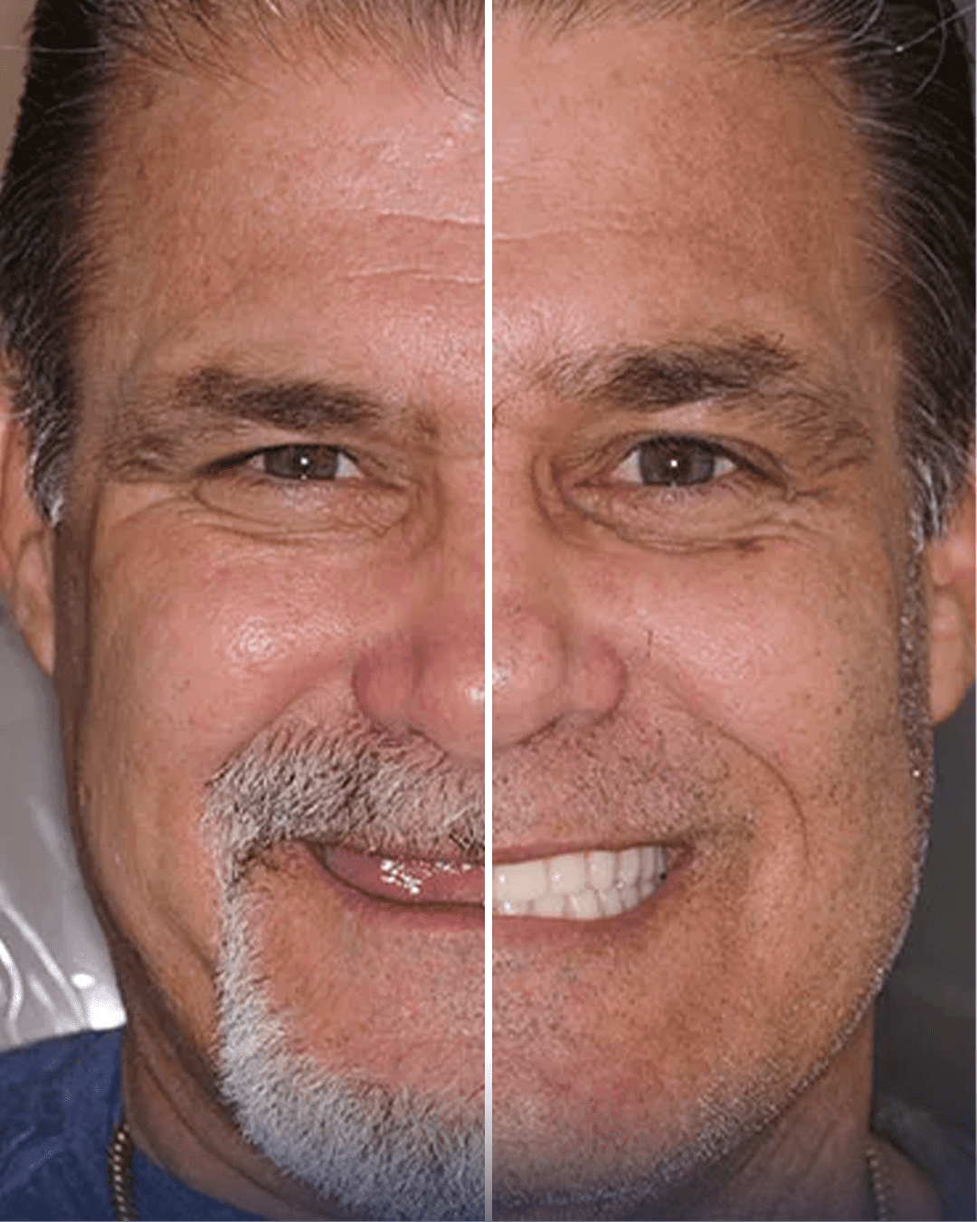Veja a diferença na foto: do "antes" completamente sem dentes e o "depois" com um sorriso natural e brilhante.